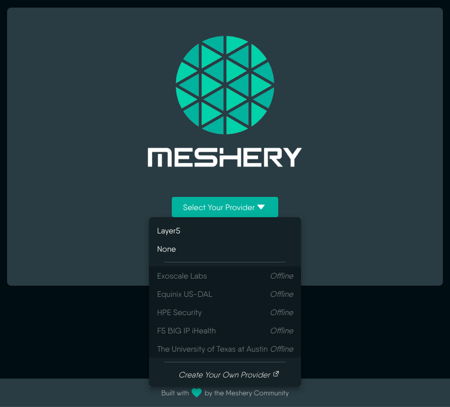 - Provider Selection: User visits Meshery and is presented with the provider selection UI at