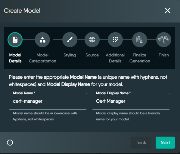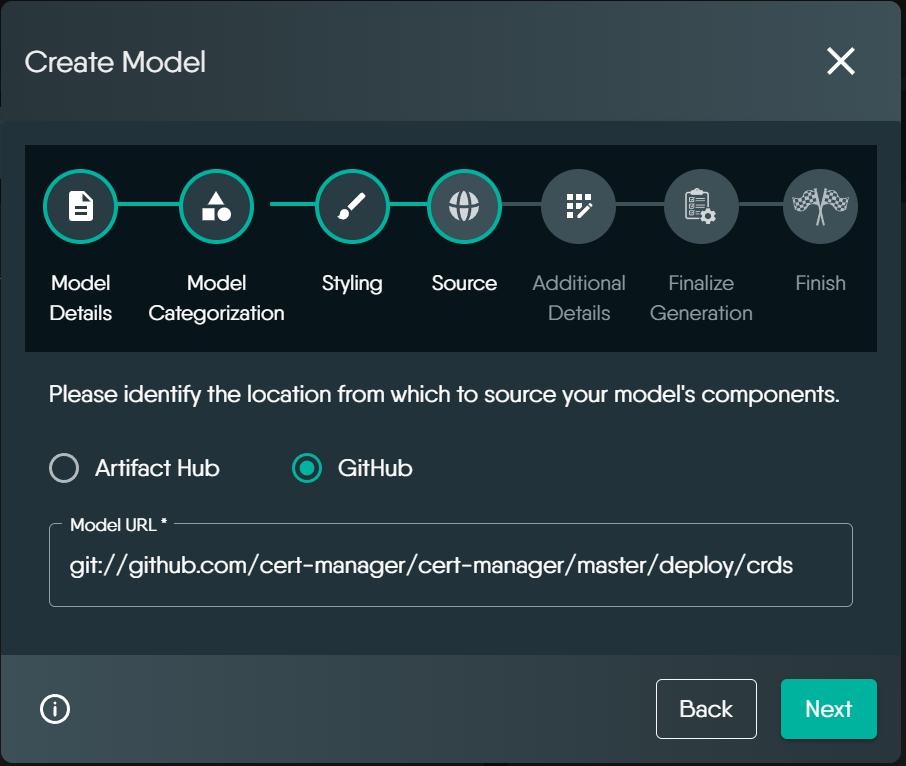 This section walks you through the Create workflow β perfect for users who want full control over naming, styling, and categorizing their models while sourcing CRDs from GitHub or ArtifactHub.