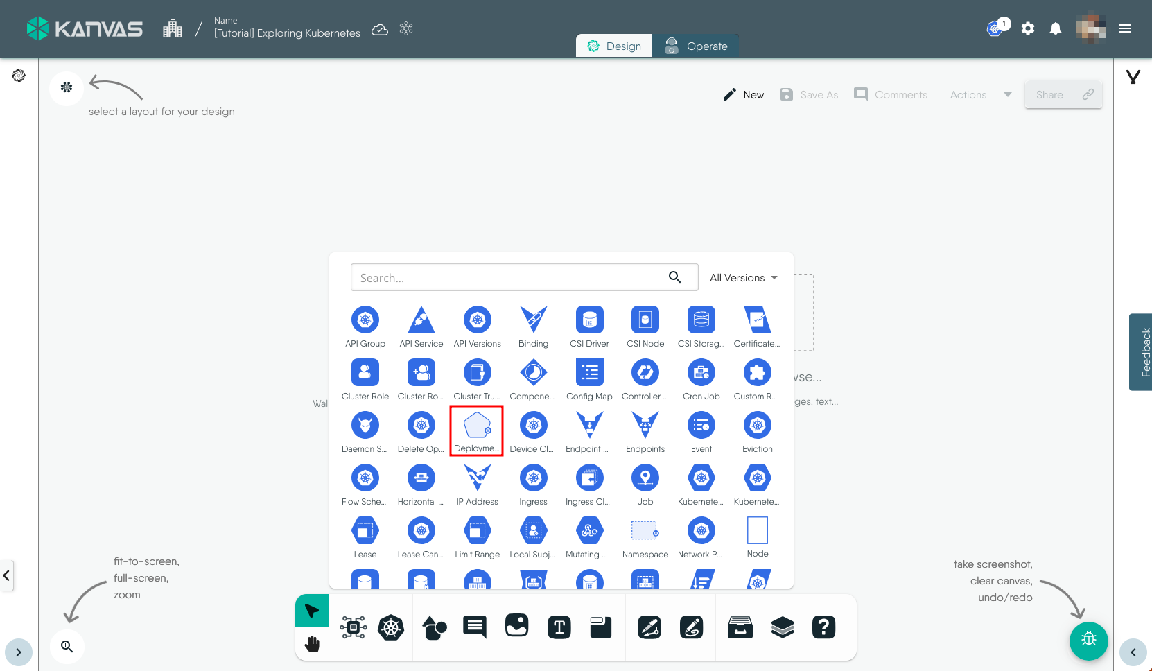 - From the floating dock below, click the Kubernetes icon and then click Deployment from the list. This will create the Deployment component on the design canvas.